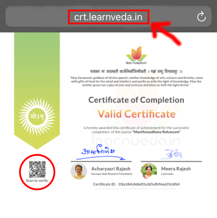 Please scan the QR code on the certificate to verify it. You will see the same certificate hosted in learnveda.in if it is valid, else you will see a message saying it is not valid.